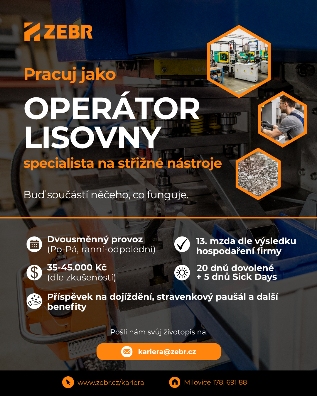 Firma ZEBR s.r.o., Milovice přijme zaměstnance na pozice soustružník a operátor lisovny. Více informací (soustružník) ZDE a (operátor lisovny) ZDE nebo na tel. 771 278 681.
